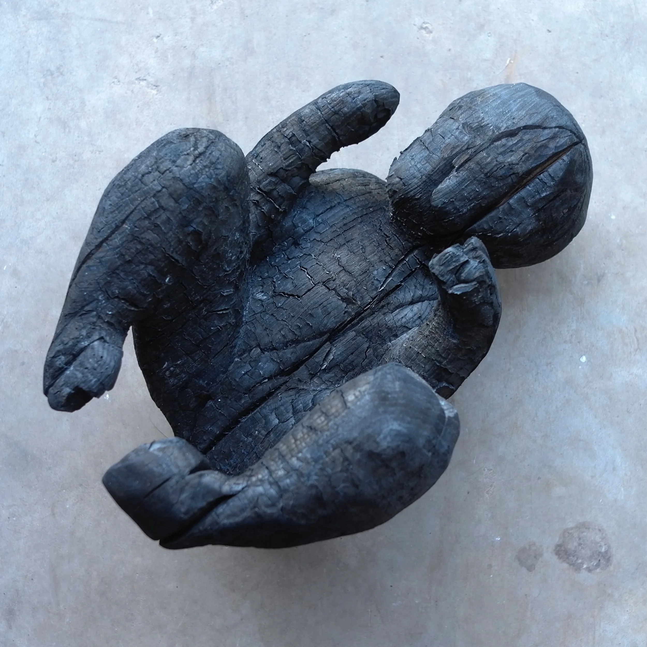 Some time ago the idea of a black wooden baby rose into my mind. Allthough it seemed a very good image I rejected it as being too confronting. I did not make it. Then I was allowed into the Boterhal, an artist community in Hoorn, as a member and at my first membership exhibition there I was allowed to use only paper and charcoal. So I did make her. During the opening of the exhibition some people came to ask me what I wanted to say with this sculpture…